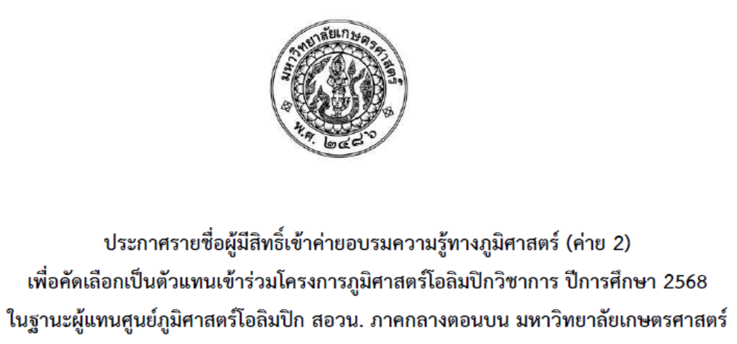 ประกาศรายชื่อผู้ได้รับการคัดเลือกเข้าอบรม ค่าย 2 (เพิ่มเติม) ภูมิศาสตร์โอลิมปิกวิชาการประจาปี 2568 (ปีการศึกษา 2567) ภาควิชาภูมิศาสตร์ คณะสังคมศาสตร์ มหาวิทยาลัยเกษตรศาสตร์ ในฐานะผู้แทนศูนย์ สอวน.วิชาภูมิศาสตร์ภาคกลางตอนบน